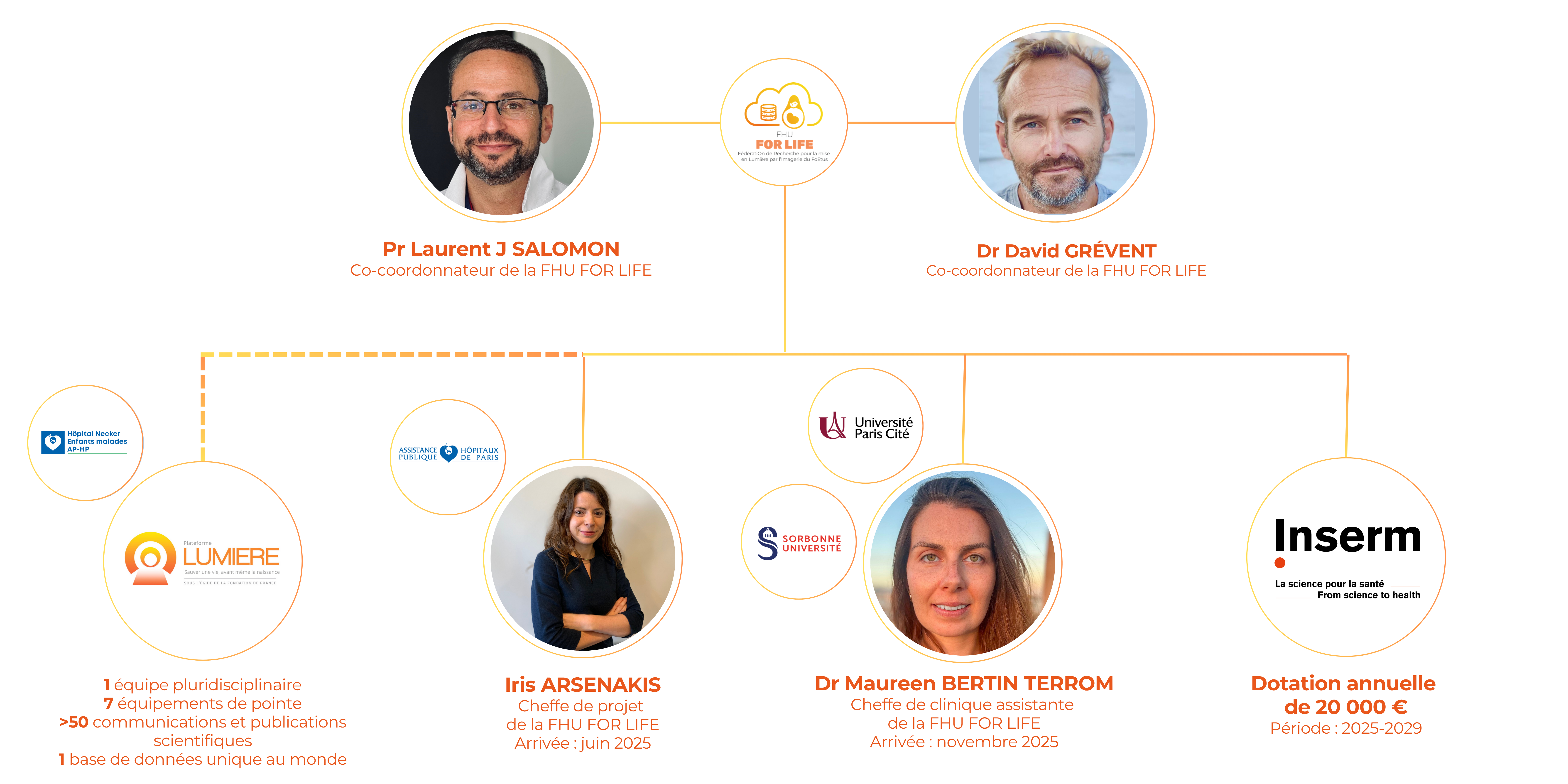 La FHU FOR LIFE est coordonnée par le Pr Laurent Salomon et le Dr David Grévent, et est basée à l’hôpital Necker-Enfants malades, dans les locaux de la Plateforme LUMIERE.